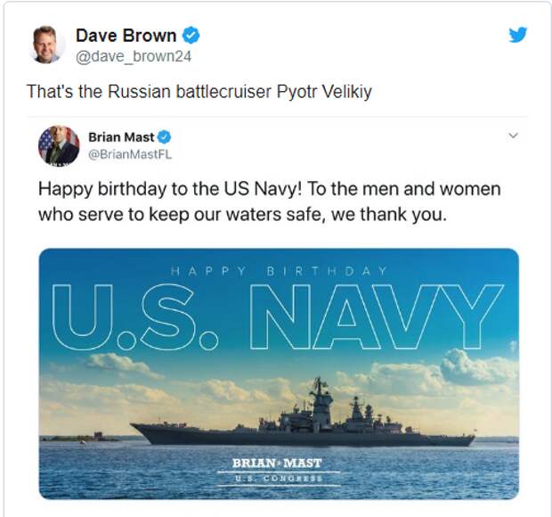 Автор ещё одного фейла — американский конгрессмен Брайан Маст. Член палаты представителей США и ветеран войны в Афганистане поздравил в Twitter американские ВМС, которые 13 октября отмечали 244-й день рождения. При этом конгрессмен ошибся и опубликовал фотографию российского атомного крейсера «Пётр Великий».